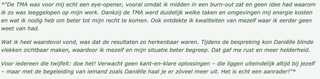 "Dankzij de TMA werd duidelijk welke taken en omgevingen mij energie kosten en wat ik nodig heb om beter tot mijn recht te komen."